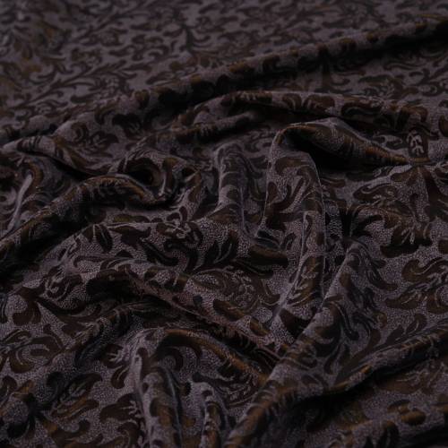 Эта премиальная итальянская ткань представляет собой сложное жаккардовое полотно, где глубокий черный ворс искусно переплетен с мерцающей бронзовой нитью основания. Плотная фактура и выразительный орнамент в стиле барокко придают материалу благородный вид, характерный для тканей высокой моды.