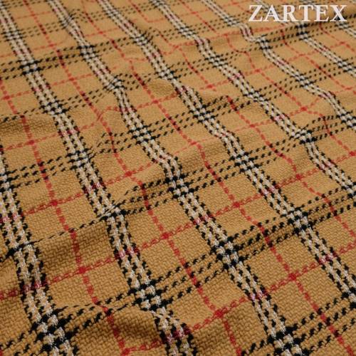 Ткань соткана из крупных нитей, что обеспечивает ей прекрасную прочность и долговечность. Бежевый фон ткани придаёт ей изысканность и утончённость, а красные, белые и черные линии, сотканные в форме клетки, создают яркий и модный акцент.