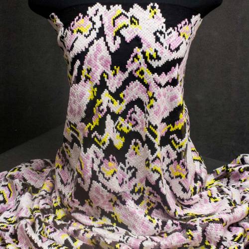 Очарование традиционного макраме и современный подход к дизайну воплощены в этом уникальном полотне. Вышитый хлопковыми нитями на сетчатой основе, каждый элемент узора соединяется в цветочный пиксельный мотив. Живописная палитра оттенков розового и желтого на темном фоне придает ткани глубину и выразительность, идеально подходящую для создания заметных элементов в современных модных коллекциях.