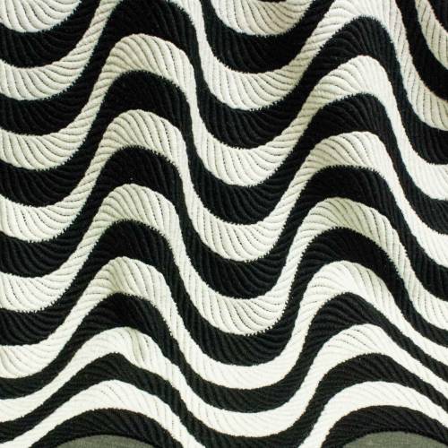 Это плотное шерстяное макраме в черно-белой цветовой гамме объединяет классические контрасты и современный дизайн. Динамичные волнообразные линии создают гипнотический узор, который придает объем и текстуру для смелых и запоминающихся образов. Такая ткань идеально подходит для структурированных пальто, жакетов и других элементов гардероба, где требуется выразительность и характер.