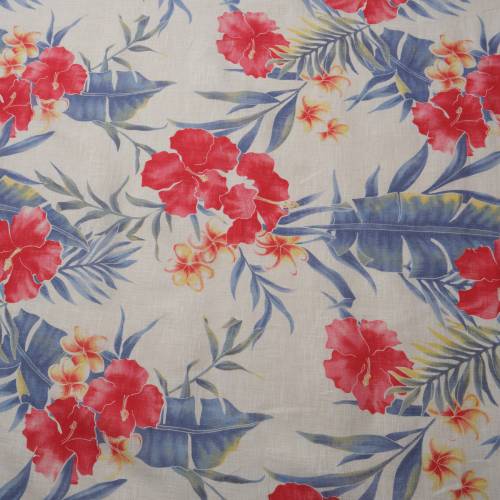 Эта эффектная итальянская ткань с ярким растительным узором создана для смелых летних образов. Натуральный молочный фон украшен крупными цветами гибискуса и тропической зеленью, что придает полотну динамику и отпускное настроение. Печать выполнена на высоком уровне, сохраняя чистоту оттенков и четкость каждой линии.