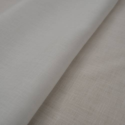 Безупречная итальянская ткань из чистого 100% льна в ослепительно белом оттенке. Полотно обладает облегченной плотностью 95 г/м², что придает ему особую нежность и деликатную прозрачность. Фактура материала классическая, с едва заметными утолщениями нитей, характерными для высококачественного натурального волокна. Ткань ложится в мягкие, воздушные драпировки и дарит ощущение прохлады.