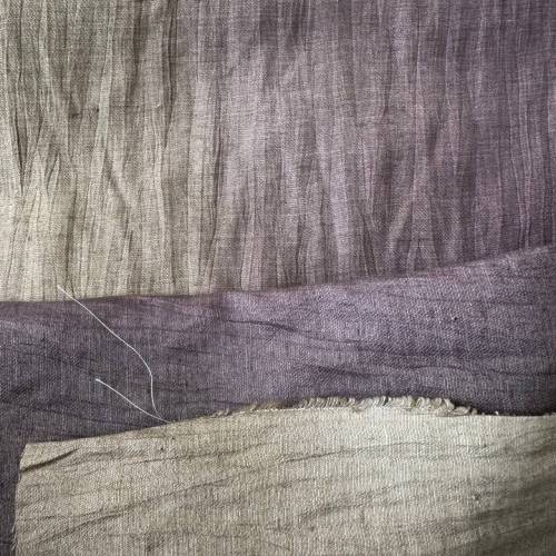 Текстильное полотно как объект современного искусства. Этот итальянский лен объединяет в себе природную аутентичность и технологичность: добавка полиамида позволяет ткани сохранять выразительную жатую фактуру (крэш) даже после стирки, делая её практически немнущейся. Плавный переход оттенков от теплых землистых тонов к благородному лиловому деграде позволяет создавать уникальные изделия, не требующие сложного кроя. Ткань плотностью 130 г/м² обладает приятной прохладой льна, она пластична и ложится в объемные, «живые» складки. Это идеальный выбор для пошива эффектных платьев-макси в стиле бохо, дизайнерских рубах и летящих сарафанов, которые станут главным акцентом летнего гардероба.