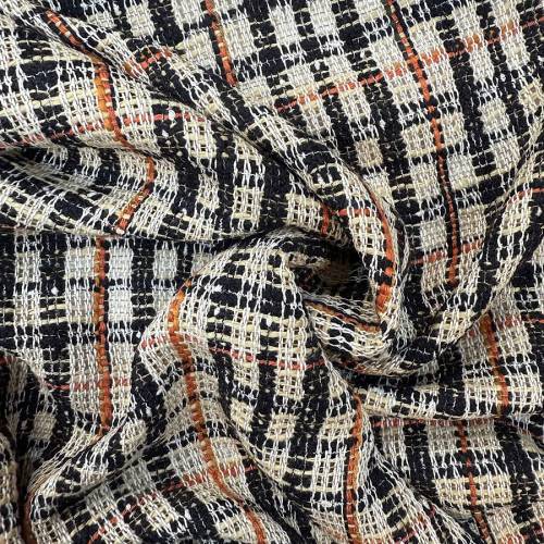 Воплощение парижского шика в его летней интерпретации. Перед вами роскошный «фантазийный» твид в стиле Chanel. В отличие от плотных зимних аналогов, эта ткань имеет структуру Summer Tweed (летний твид): переплетение нитей воздушное, рыхлое, слегка разреженное, что позволяет ткани «дышать» и красиво пропускать воздух. На контрасте черно-белой графичной основы эффектно выделяются вертикальные нити теплого терракотово-рыжего оттенка.