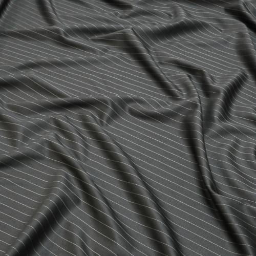 Воплощение статуса и итальянского портновского искусства. Это ткань из легендарной коллекции «Four Seasons» от Loro Piana, созданная из отборной шерсти мериноса качества Super 130's. Волокно настолько тонкое и длинное, что полотно приобретает естественную шелковистость и способность к терморегуляции: в таком костюме комфортно и в отапливаемом офисе, и на улице в любое время года. Дизайн — каноническая тонкая полоска (Pinstripe) на глубоком черном фоне, символ деловой хватки и элегантности. Ткань безупречно держит стрелку на брюках, восстанавливает форму после смятия и обладает деликатным, дорогим свечением. Идеальный выбор для пошива костюма-тройки «с иголочки» или строгого двубортного жакета.