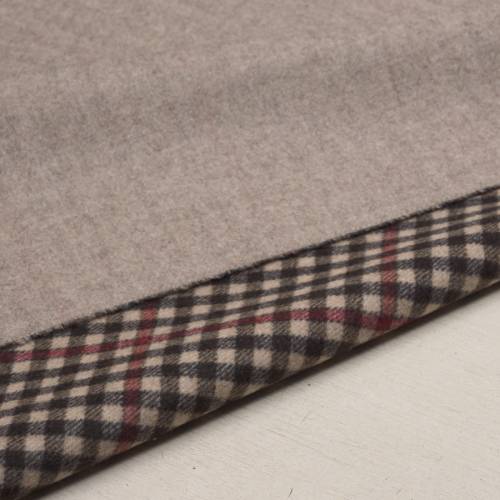 Воплощение аристократического стиля «Country Chic» и итальянского мастерства от дома Loro Piana. Это эксклюзивное двустороннее полотно (Double-Face) цитирует эстетику культовых изделий бренда — курток Horsey и накидок-кейпов. Одна сторона представляет собой однотонную меланжевую поверхность в уютном оттенке «Кофе с молоком» (Cafe au Lait) или теплого латте. Оборотная сторона выполнена в классическую клетку Heritage Gun Club: на бежевом фоне пересекаются строгие графитовые и акцентные бордово-красные линии. Состав из 72% отборной вирджинской шерсти (Virgin Wool) и 28% кашемира является идеальным балансом: шерсть обеспечивает изделию «каркас», износостойкость и защиту от ветра, а высокий процент кашемира дарит полотну благородную мягкость и тепло. Плотность 420 г/м² гарантирует комфорт в зимний период. Уникальное преимущество артикула — ширина 165 см, которая позволяет существенно оптимизировать раскрой. Это идеальный выбор для пошива пальто-даффлкотов, английских бушлатов, теплых кейпов и жилетов, где клетчатая сторона станет изысканной внутренней отделкой или основным акцентом.