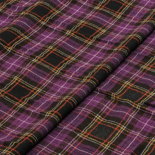 Дух бунтарства и высокой моды в одном отрезе. Это легкое полотно из 100% шерсти выполнено в смелой интерпретации классического тартана: глубокий фиолетовый и черный цвета прорезаны энергичными желтыми линиями. Главная «фишка» ткани — эффект крэш (crinkle): поверхность имеет стабильную мятую структуру, которая придает изделию дизайнерский объем и избавляет от необходимости утюжки. При плотности 190 г/м² шерсть воздушная, но теплая, она идеально ложится в сложные драпировки. Это лучший выбор для создания авангардных платьев с асимметричным кроем в стиле Vivienne Westwood (модель Sunday или New Virginia), многоярусных юбок в стиле бохо-шик или акцентных рубах, которые станут центром образа.