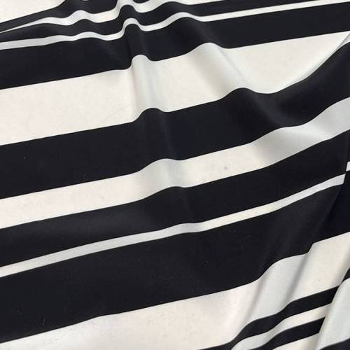 Эталон элегантности и графического ритма. Ткань представляет собой роскошный плательный крепдешин с культовым принтом — черно-белой полоской. Особенность дизайна заключается в чередовании линий разной ширины, что создает динамичный визуальный эффект и помогает моделировать силуэт, вытягивая его по вертикали. Поверхность ткани матовая, с едва уловимым благородным «зерном», характерным для крепового кручения нитей, что придает полотну сдержанный аристократичный вид без лишнего блеска.
